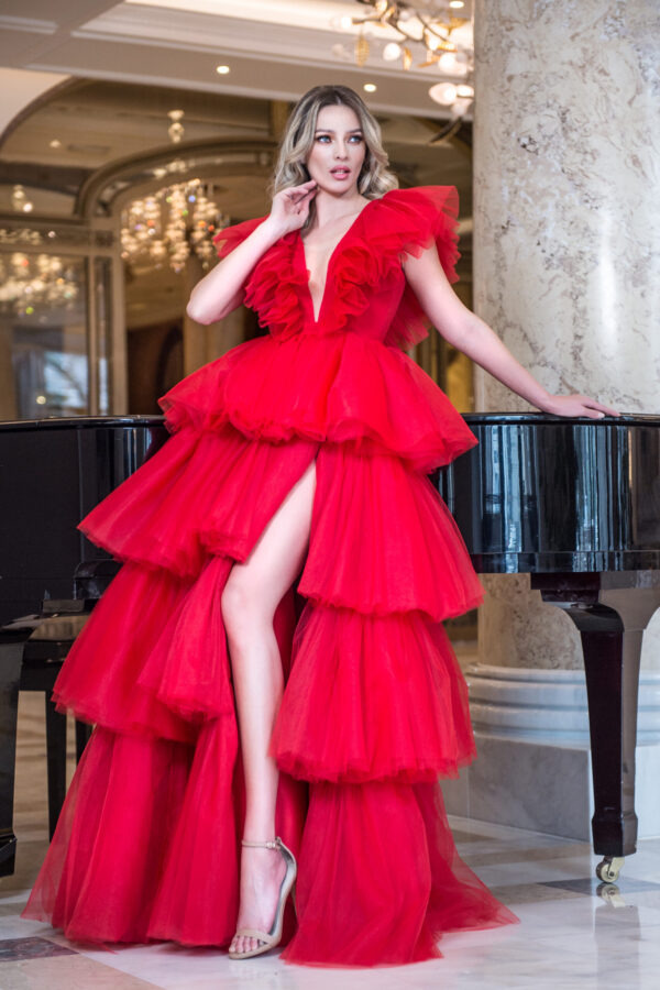 Prețul inițial a fost: 1.790,00 lei.1.490,00 leiPrețul curent este: 1.490,00 lei.Rochie midi realizata din tul de matase naturala 100%, Cu pliuri oblice, Culoare Rosu, IRIS