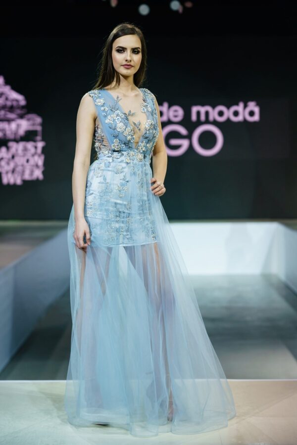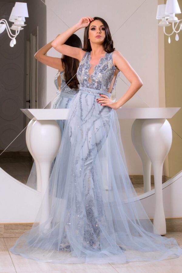 Rochie Lunga, Tip Sirena, Din Broderie cu Perle Delicate, Cristale si Paiete Discrete, Culoare Bleo LUXURY