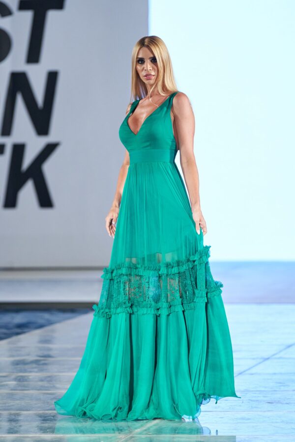 Rochie Lunga, Din Matase Naturala Imbinata cu Insertii din Dantela Frantuzeasca Chantilly, Culoare Verde EMERALD