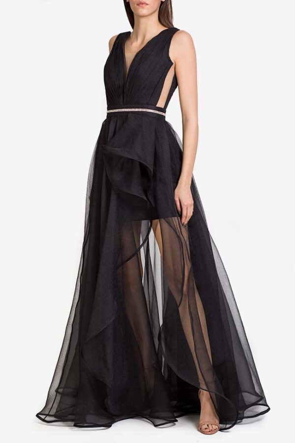 Rochie Lunga, Din Organza cu Matase, accesorizata cu pietre din cristale, Culoare Negru JULIA