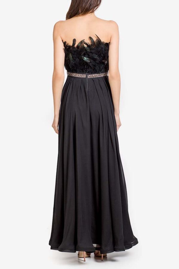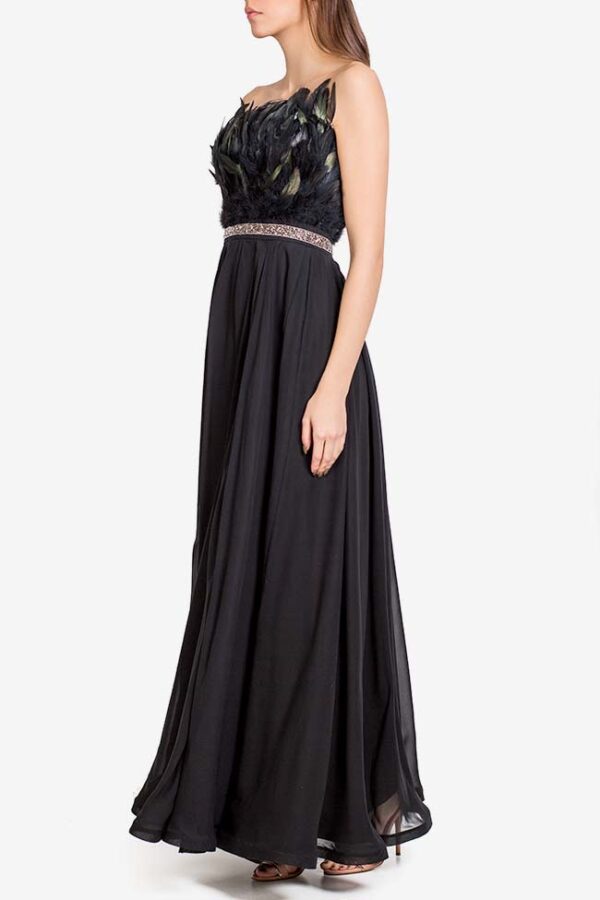 Rochie Lunga, Tip Corset, Din Voal cu Matase si Bust din Pene Naturale, Culoare Negru JANE