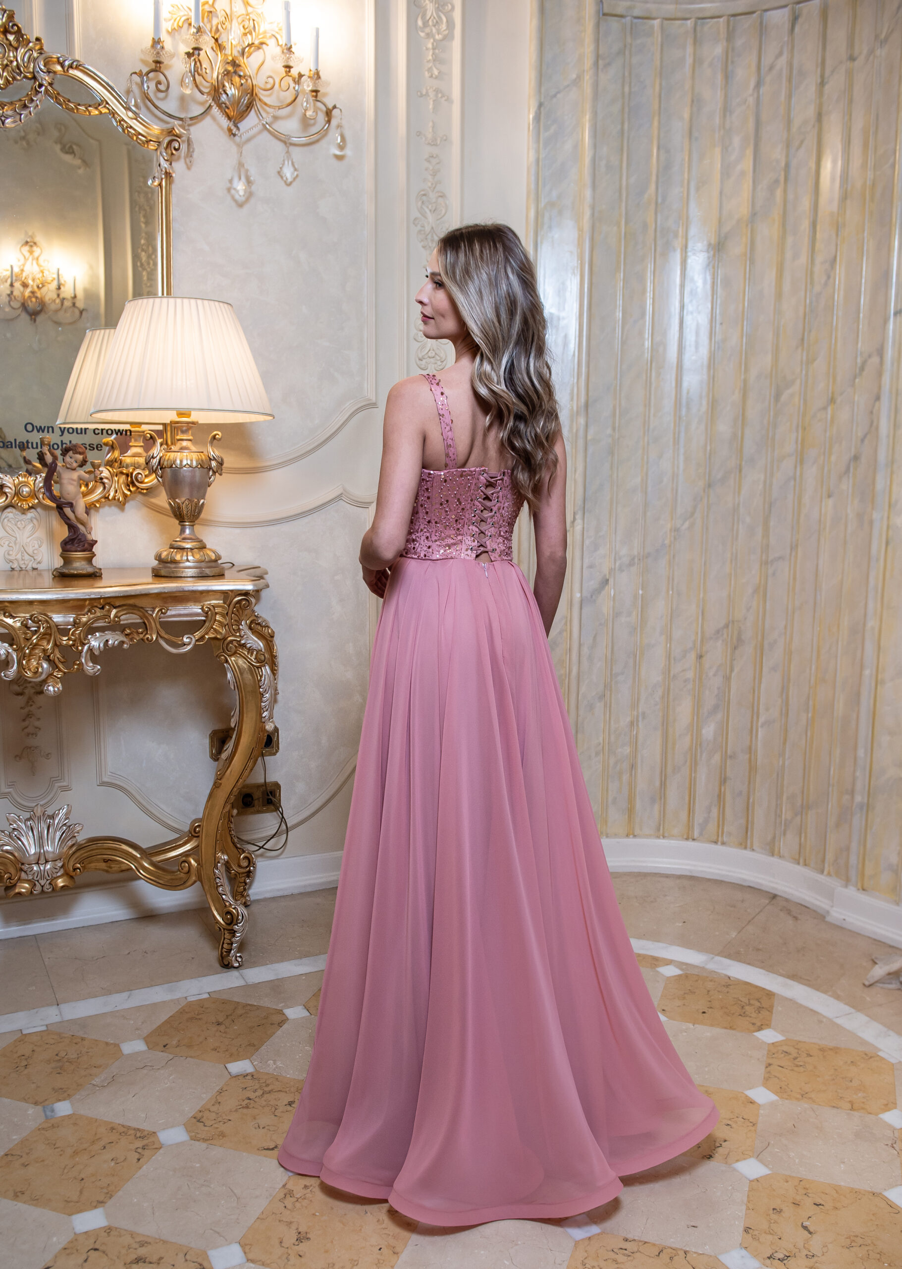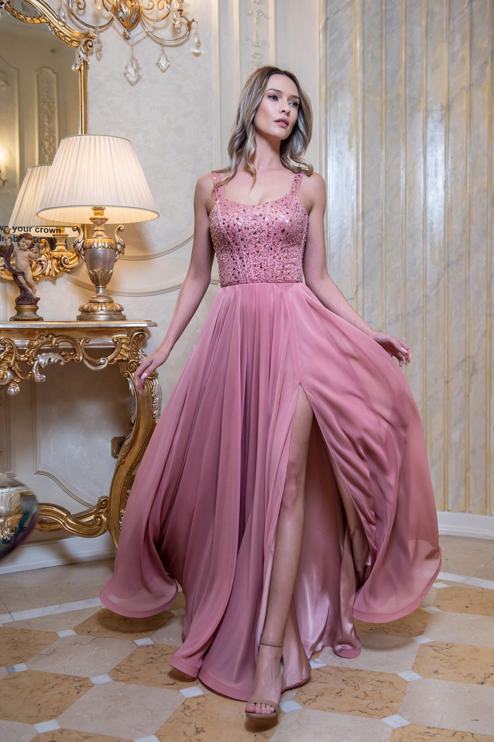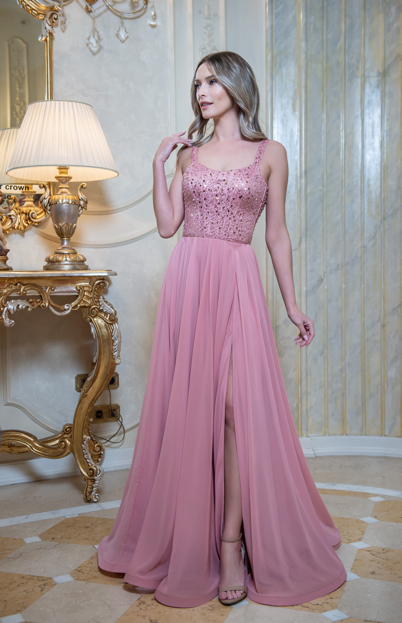 – Rochie lunga, tip corset, cupe incorporate, fara maneci, crapatura pe picior, pliuri fusta