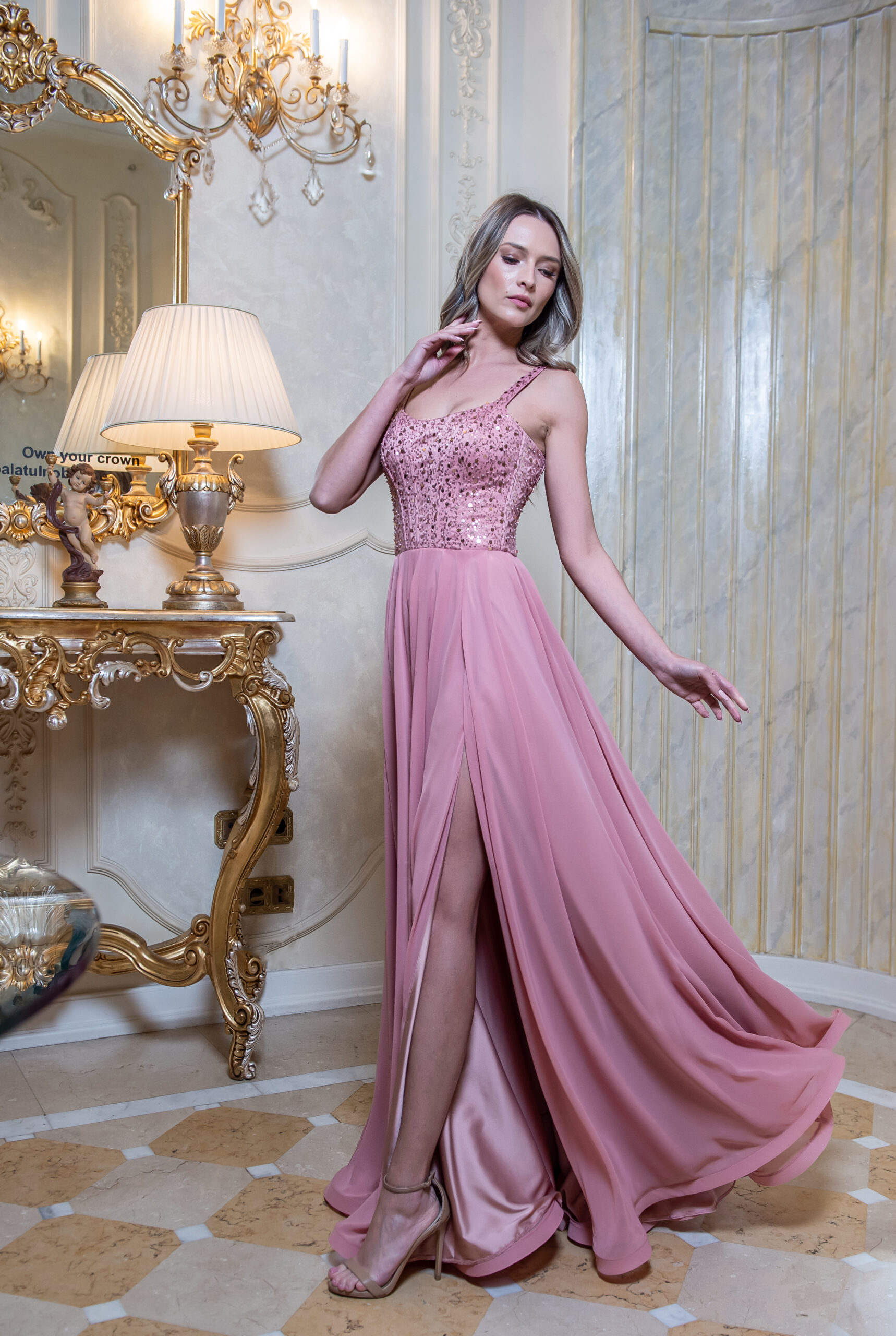 Rochie lunga, vaporoasa realizata din dantela cu pietre si perle si voal cu matase, culoare Roz pudra, LORA